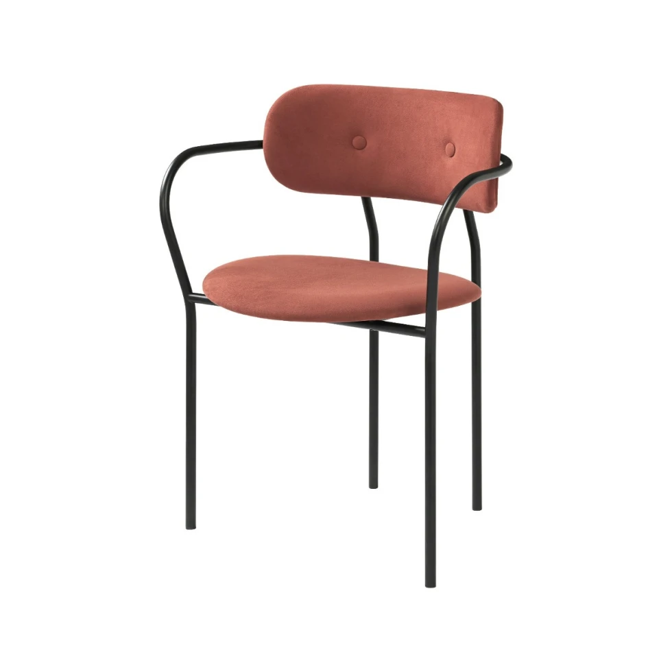 Tapicerowane krzesło Coco z podłokietnikami od Gubi zostało zaprojektowane tak, aby zapewnić jak najwyższy komfort użytkowania. Siedzisko i oparcie zostało wykonane ze sklejki tapicerowanej tkaniną dostępną w różnych kolorach i wzorach. Rama krzesła wykonana została ze stali malowanej proszkowo. Krzesło charakteryzuje się niepowtarzalnym wyglądem, dzięki czemu komponuje się z różnymi meblami oraz dodatkami. Krzesło Coco to zarówno idealna propozycja do nowoczesnej jadalni, jak również do restauracji czy kawiarni.