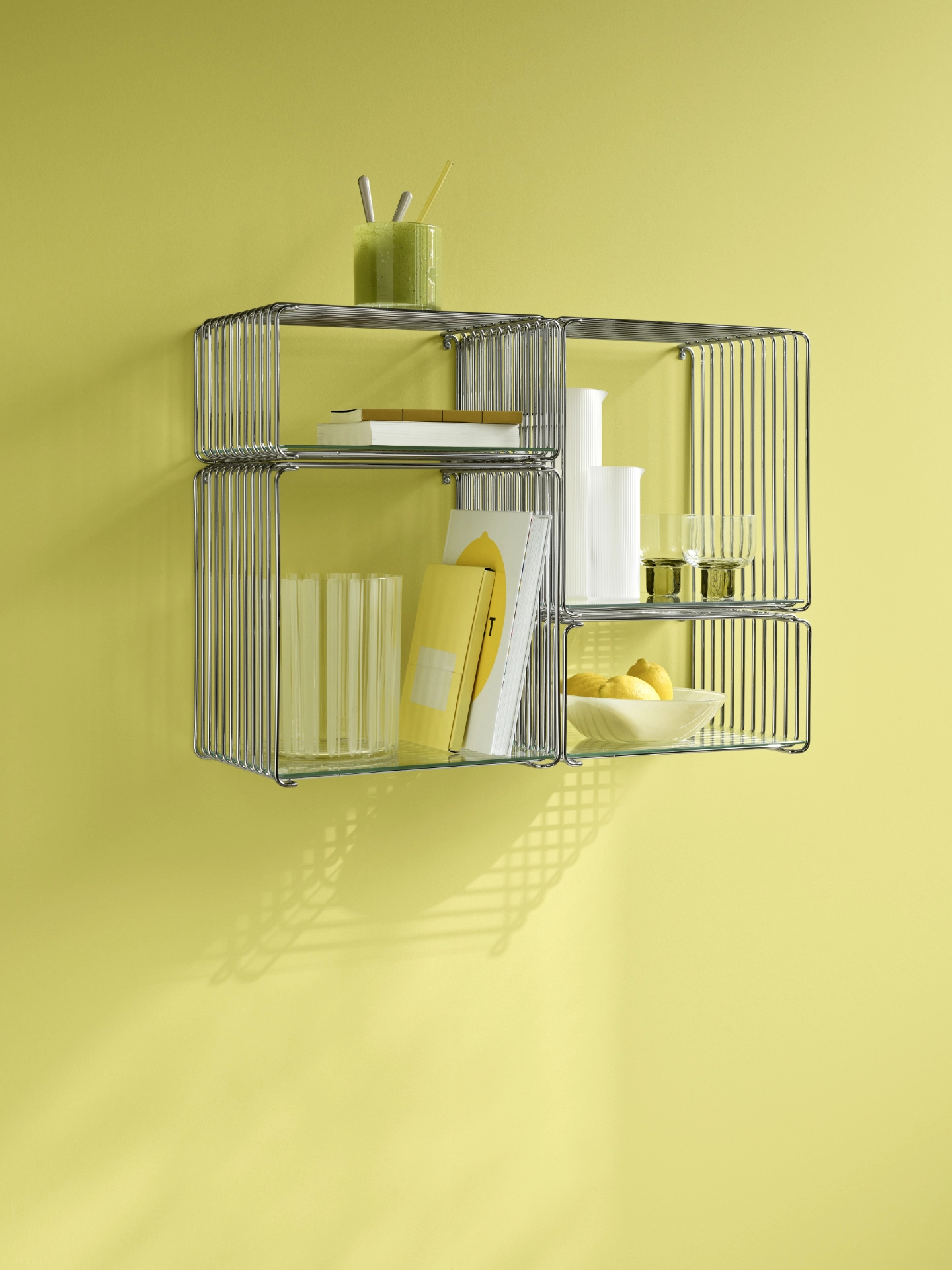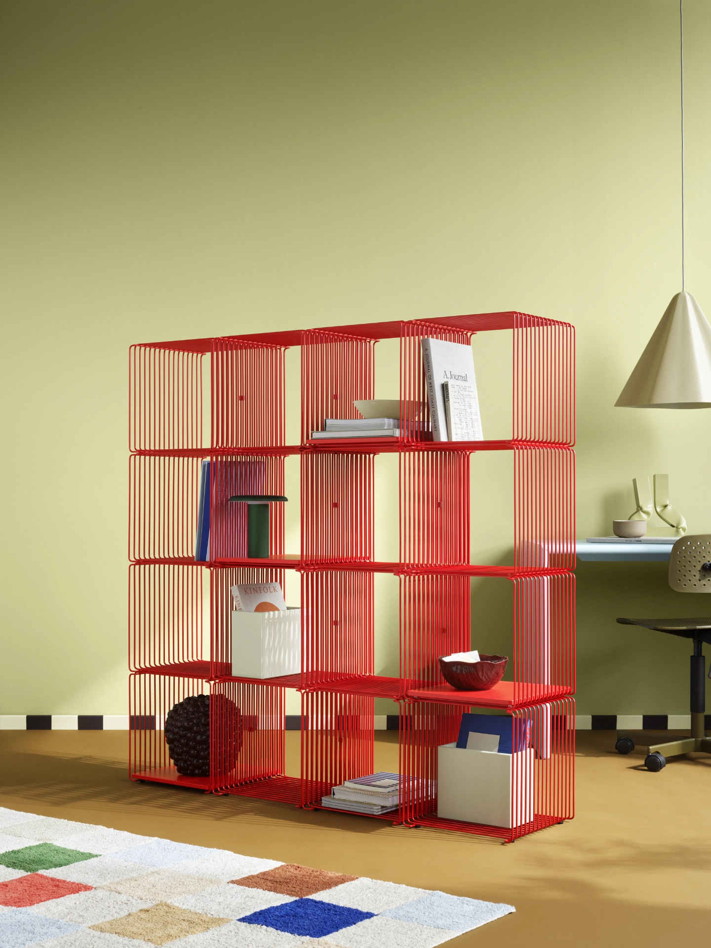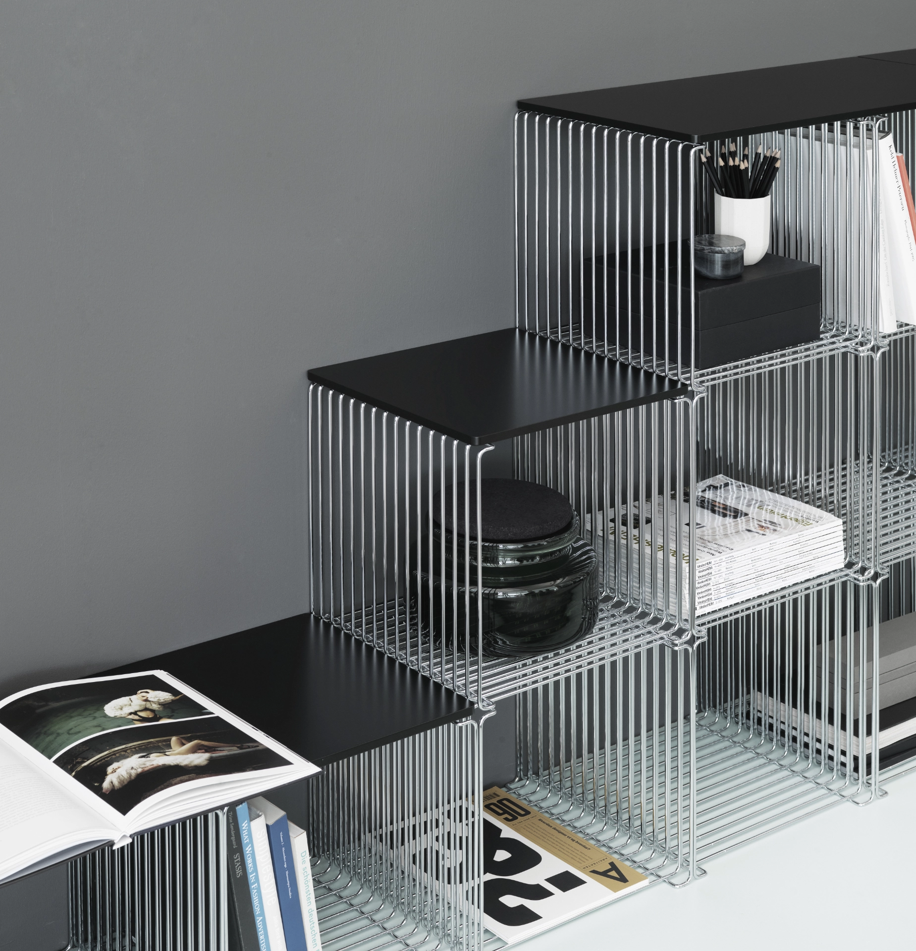 Kolekcja Panton Wire to modułowy system półek zaprojektowany w 1971 roku przez Verner Panton, łączący surowość stalowej siatki z ponadczasową elegancją. Lekka, industrialna forma pozwala tworzyć elastyczne konfiguracje – od pojedynczych modułów ustawionych na podłodze, przez kompozycje ścienne, aż po ażurowe przegrody przestrzeni. System dostępny jest w różnych głębokościach i kolorach, a nowe moduły prostokątne oraz wersje podwieszane umożliwiają budowanie bardziej asymetrycznych, dynamicznych układów. Dodatkowe blaty i półki wewnętrzne pozwalają spersonalizować całość i dopasować ją do charakteru wnętrza.