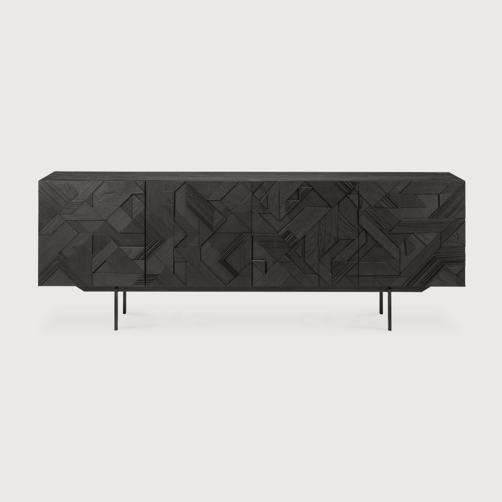 Kolekcja Graphic marki Ethnicraft, zaprojektowana przez Alaina van Havre, wyróżnia się charakterystycznym frontem powstałym z warstwowo układanych i łączonych trójkątnych kształtów, które tworzą wizualnie dynamiczną, przyciągającą uwagę kompozycję z drewna tekowego. Zastosowanie wielu warstw nadaje meblom głębi, a dodatkowe podkreślenie naturalnych właściwości drewna wnosi do formy ciepło i elegancję. Meble wykonane są z czarno bejcowanego teaku z lakierowanym, szczotkowanym wykończeniem, które uwydatnia rysunek słojów, osadzonego na czarnych metalowych nogach. Ręczny charakter produkcji sprawia, że każdy egzemplarz delikatnie się różni, co podkreśla jego unikatowość.