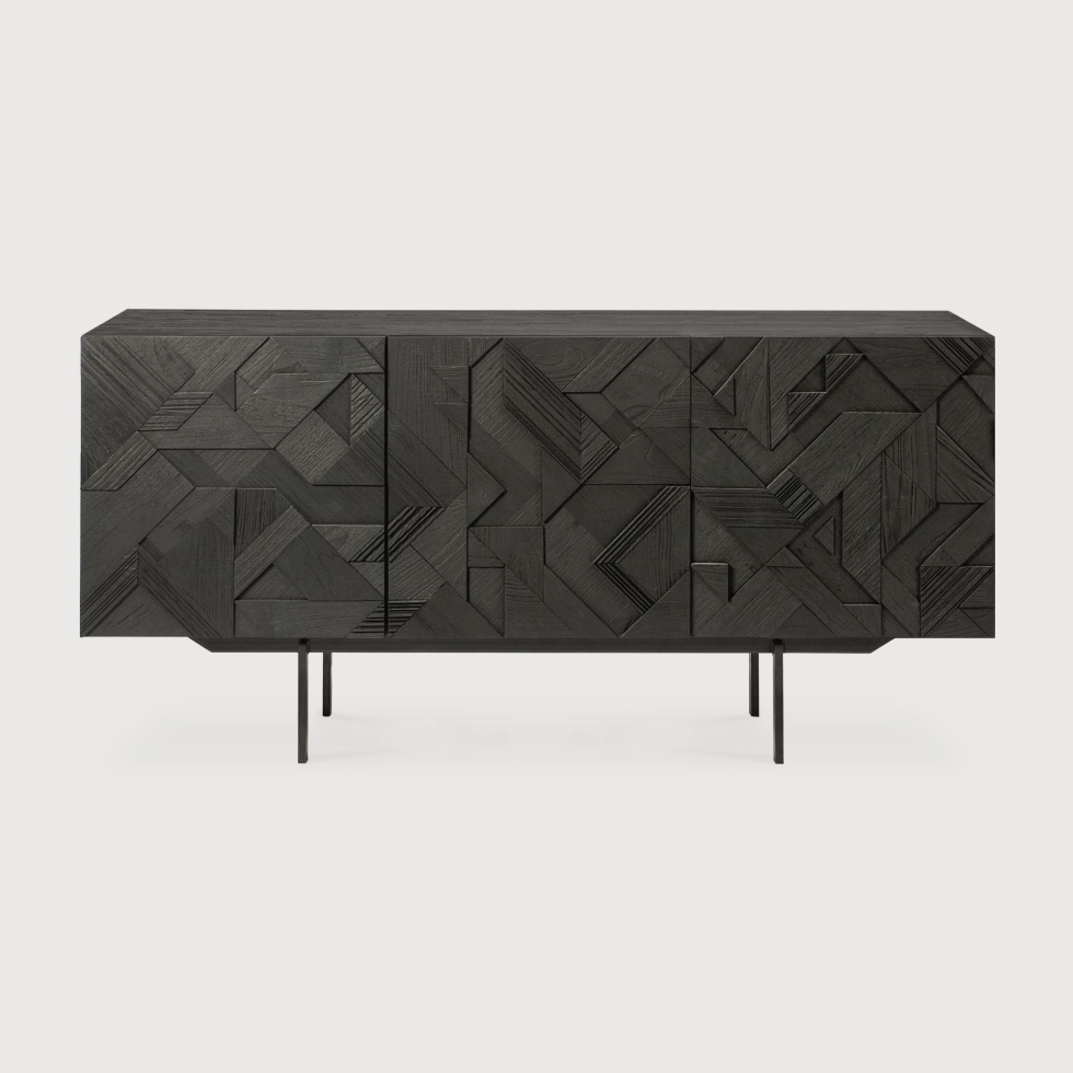 Kolekcja Graphic marki Ethnicraft, zaprojektowana przez Alaina van Havre, wyróżnia się charakterystycznym frontem powstałym z warstwowo układanych i łączonych trójkątnych kształtów, które tworzą wizualnie dynamiczną, przyciągającą uwagę kompozycję z drewna tekowego. Zastosowanie wielu warstw nadaje meblom głębi, a dodatkowe podkreślenie naturalnych właściwości drewna wnosi do formy ciepło i elegancję. Meble wykonane są z czarno bejcowanego teaku z lakierowanym, szczotkowanym wykończeniem, które uwydatnia rysunek słojów, osadzonego na czarnych metalowych nogach. Ręczny charakter produkcji sprawia, że każdy egzemplarz delikatnie się różni, co podkreśla jego unikatowość.