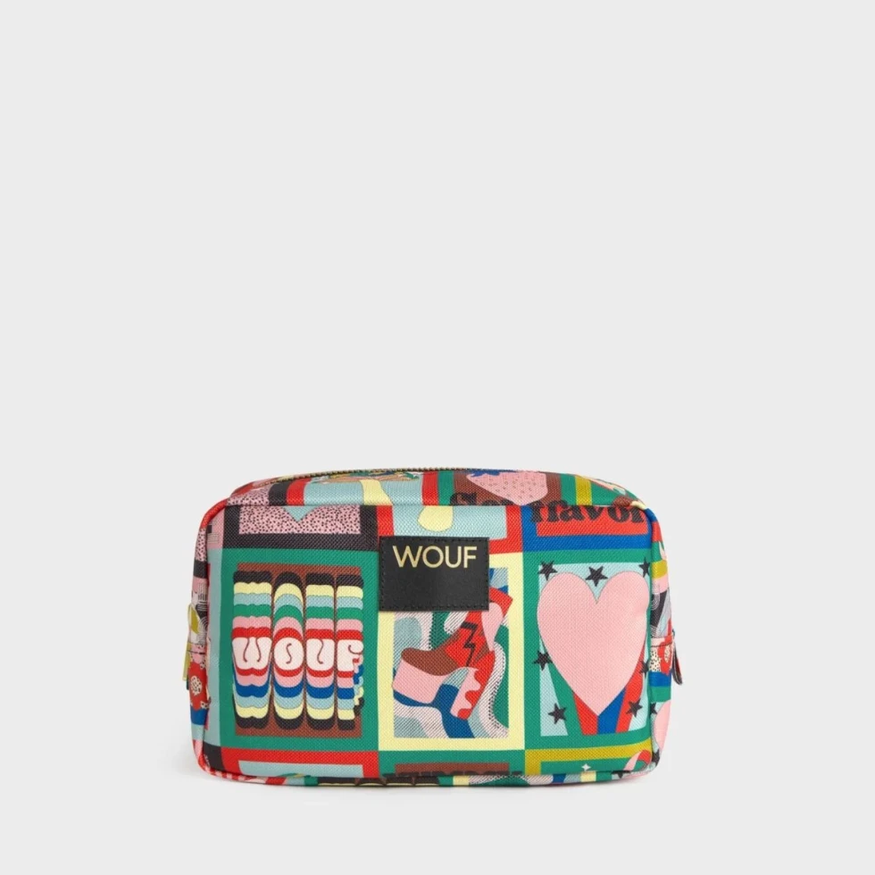 Kosmetyczka od marki Wouf z pojedynczą komorą zamykaną na zamek błyskawiczny. Wykonana z materiału w 100% pochodzącego z recyklingu, ma wodoodporne wykończenie. Nadruk został wykonany barwnikami certyfikowanymi Oeko-tex®. Produkt wykonany w Hiszpanii.