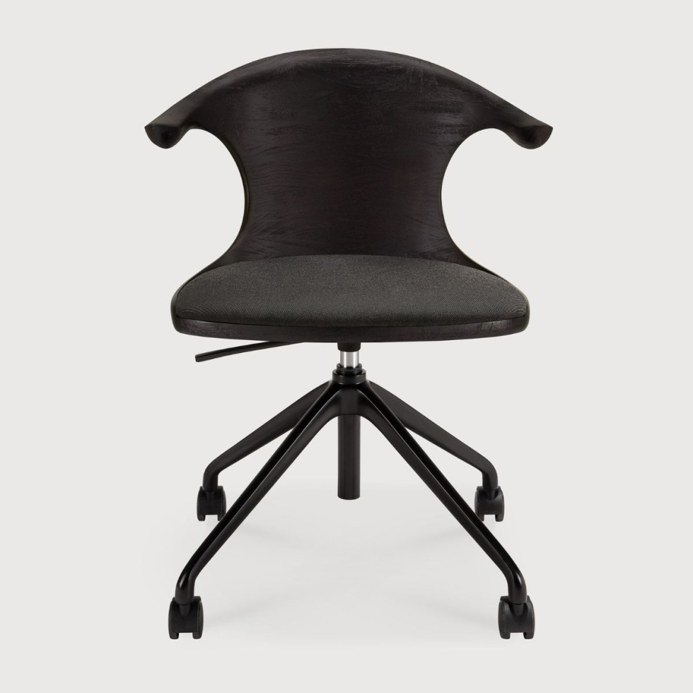 Kolekcja Flow wyróżnia się miękkimi liniami i zaokrągloną formą, nadającą jej lekko retro, ale nowoczesny charakter. Projekt został stworzony z myślą o elastycznych, współczesnych przestrzeniach pracy. Krzesło łączy lite drewno tekowe z wygodnym siedziskiem, oferując stabilne i komfortowe podparcie podczas pracy przy biurku, oraz regulację siedziska. Subtelna forma sprawia, że łatwo wpisuje się zarówno w klasyczne, jak i nowoczesne wnętrza.