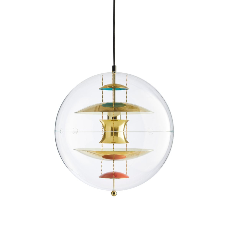 Verpan VP Globe Brass Ø40 to jedna z najbardziej rozpoznawalnych lamp Vernera Pantona z 1969 roku, zaprojektowana jako świetlna forma, która przyciąga uwagę i jednocześnie organizuje przestrzeń. Konstrukcja opiera się na idealnie przejrzystej, akrylowej kuli, wewnątrz której zawieszony jest system pięciu reflektorów w wykończeniu mosiężnym, utrzymywanych na trzech stalowych łańcuchach.