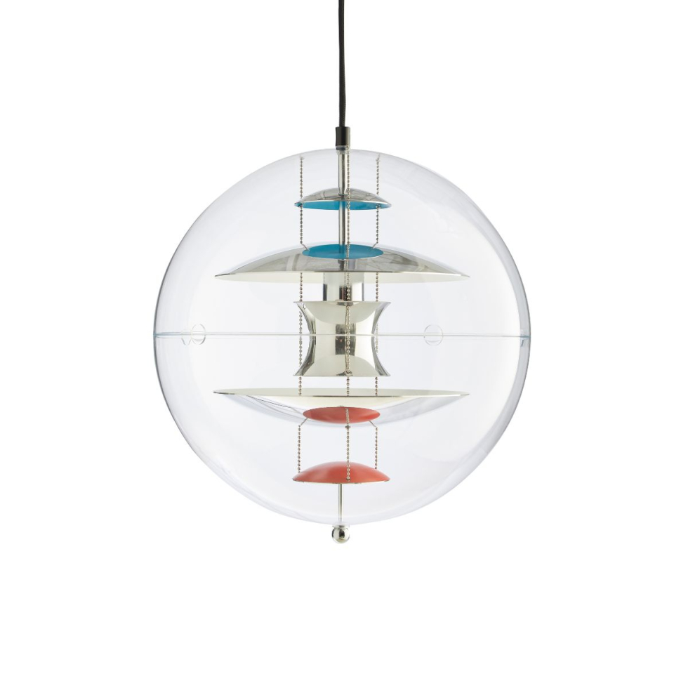 Verpan VP Globe Pendant to jeden z najbardziej rozpoznawalnych projektów Verner Panton z 1969 roku, zaprojektowany jako świetlna forma, która nie tylko oświetla, ale organizuje i definiuje przestrzeń. Konstrukcja opiera się na idealnie przejrzystej, akrylowej kuli, wewnątrz której zawieszony jest system pięciu reflektorów wykonanych z aluminium, utrzymywanych na trzech stalowych łańcuchach. Centralnie umieszczone źródło światła odbija się od wewnętrznych elementów, dzięki czemu światło nie jest emitowane bezpośrednio, lecz filtrowane i rozpraszane wielowarstwowo. Taka konstrukcja eliminuje efekt olśnienia i tworzy miękkie, ambientowe oświetlenie o wyraźnej głębi i przestrzenności.