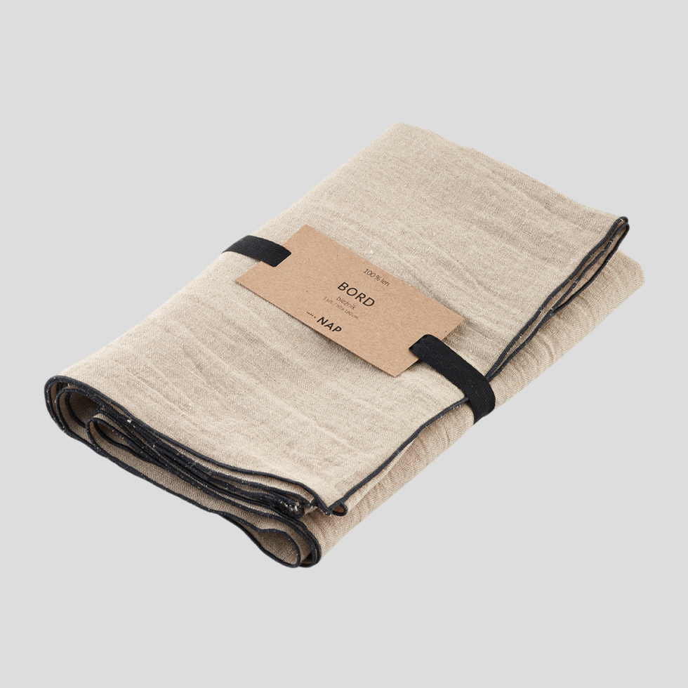 Bieżnik z nowej kolekcji tekstylnej Bord. Wykonany w 100% z lnu litewskiego o gramaturze 190g/m2. Materiał jest wytrzymały, nabiera szlachetności z każdym praniem, nie wymaga prasowania. Bord po francusku znaczy krawędź. Kolekcję charakteryzuje obszycie wokół kontrastową nicią. Bieżniki w rozmiarze 50 x 180 cm. Do wyboru cztery kolory obszycia krawędzi – cognac, olive, beige i anthracite.