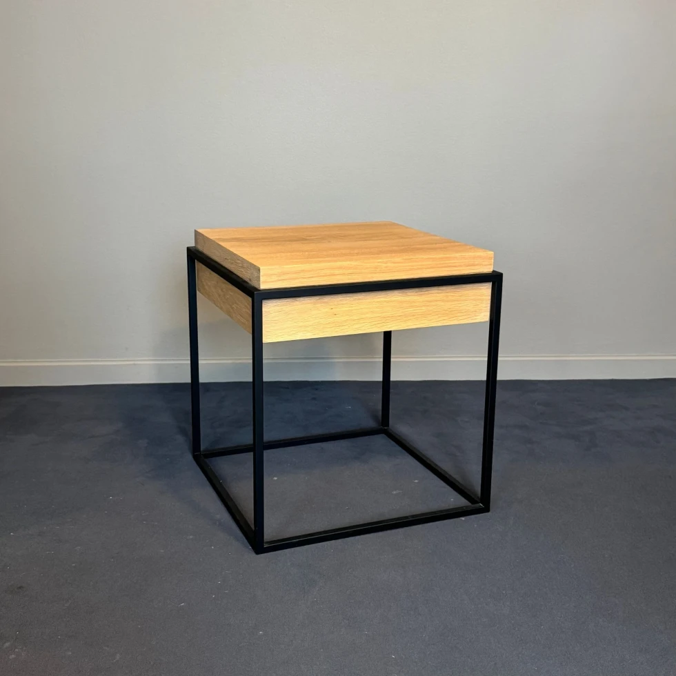 Stolik boczny Monolit marki Ethnicraft to mebel o lekkiej, geometrycznej formie. Połączenie naturalnego dębu z czarnym metalem nadaje jej elegancki, ponadczasowy charakter, a unoszony blat zapewnia wygodne miejsce na podręczne drobiazgi.