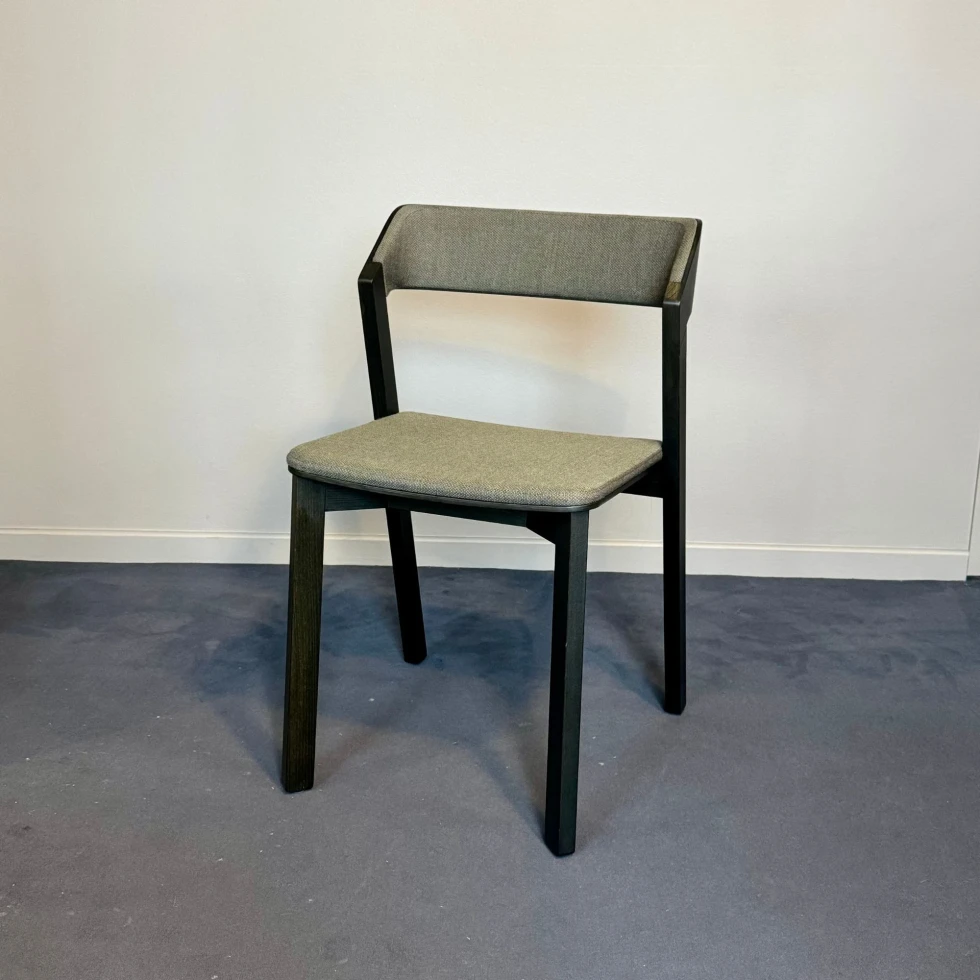Krzesło Merano to połączenie solidnej podstawy wykonanej z litego drewna z profilowaną sklejką zastosowaną w siedzisku i oparciu. Takie nietypowe połączenie pozwoliło na stworzenie krzesła zadziwiająco lekkiego i wyjątkowo subtelnego w konstrukcji, a także komfortowego w użytkowaniu. Zastosowana w produkcji zaawansowana technologia produkcji pozwoliła wyeliminować wszystkie wkręty oraz inne metalowe części. Krzesło posiada tapicerowane siedzisko oraz oparcie. Zostało obite naturalną tkaniną Fiord 2 (92% wełna, 8% nylon) w kolorze 0967. Jest to bardzo odporny i szlachetny materiał.