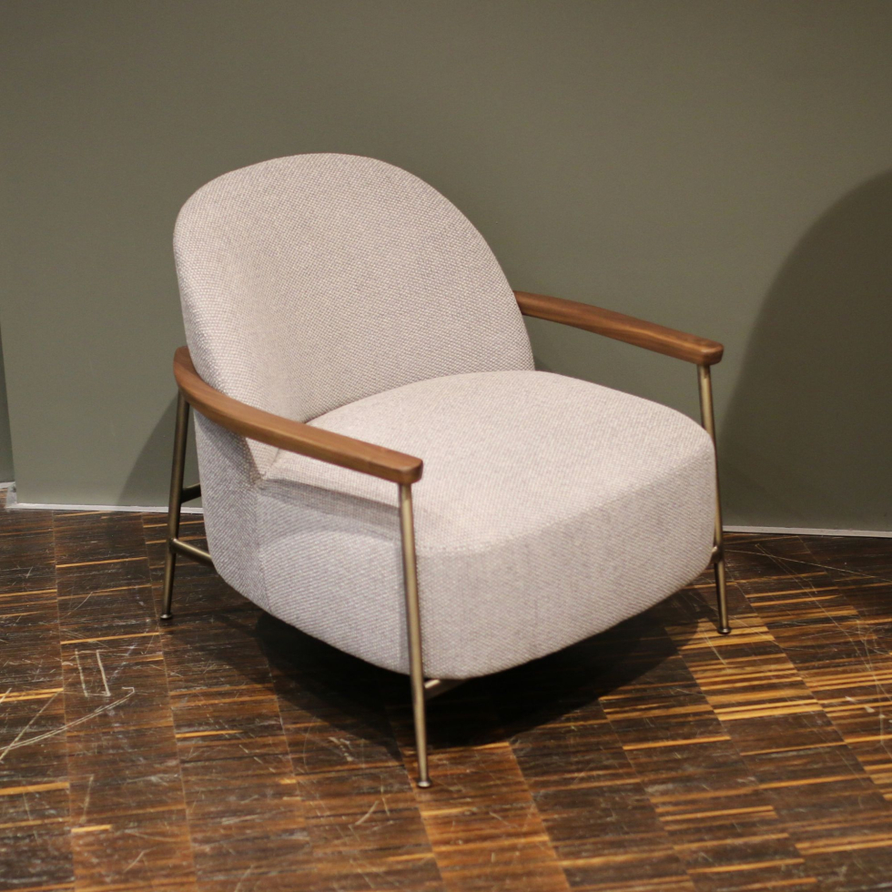 Fotel Sejour marki GUBI to elegancka propozycja łącząca nowoczesny komfort z wyrafinowanymi detalami. Model osadzony jest na podstawie w wykończeniu Antique Brass, a podłokietniki z orzecha dodają mu ciepła i ponadczasowego charakteru. Tapicerka Safire 008 to strukturalna tkanina o interesującym splocie i dużej wytrzymałości, wykonana z mieszanki 43% wiskozy, 17% poliakrylu, 15% wełny, 9% bawełny, 8% poliesteru i 8% lnu, która łączy trwałość z bogatą fakturą i eleganckim wyglądem.