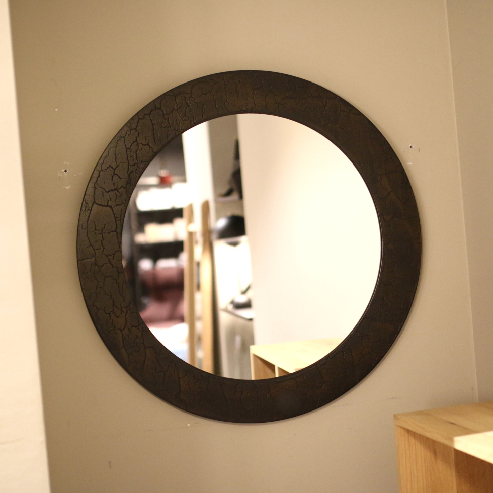 Okrągłe lustro ścienne Umber Sphere Ethnicraft o średnicy 78 cm, ręcznie wykonane przez wykwalifikowanych rzemieślników. Charakterystyczna, bursztynowa rama powstała poprzez mieszanie naturalnych proszków mineralnych oraz pigmentów kolorystycznych. Ze względu na ręczne wykonanie, produkt jest unikatowy.