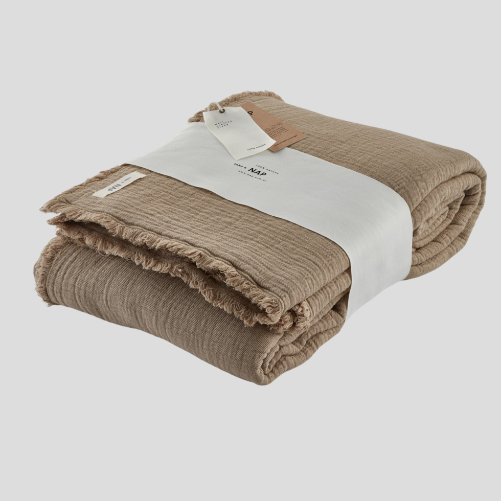 Narzuta z kolekcji Terra wykonana jest z delikatnego dla skóry muślinu. Narzuta jest przewiewna oraz przyjemna w dotyku. Dodatkowo muślin jest wyjątkowo wytrzymały oraz odporny na zagniecenia i zabrudzenia. Lekkości kolekcji nadaje ozdobny brzeg z krótkimi frędzlami.