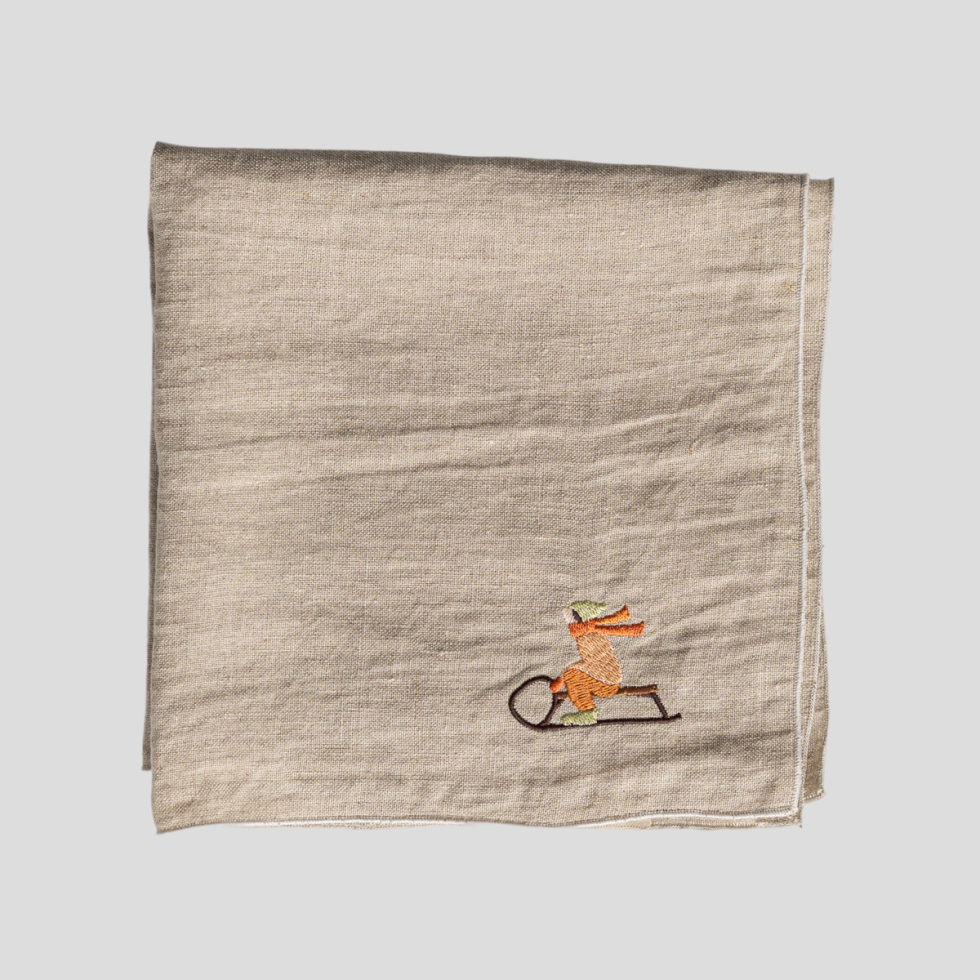 Serwetka z kolekcji tekstylnej Bord z haftem sportów zimowych. Wykonana w 100% z lnu litewskiego o gramaturze 190g/m2. Materiał jest wytrzymały, nabiera szlachetności z każdym praniem, nie wymaga prasowania. Doskonale sprawdzi się jako ozdoba stołu lub serwetki pod sztućce. Kolekcję charakteryzuje obszycie wokół kontrastową nicią.