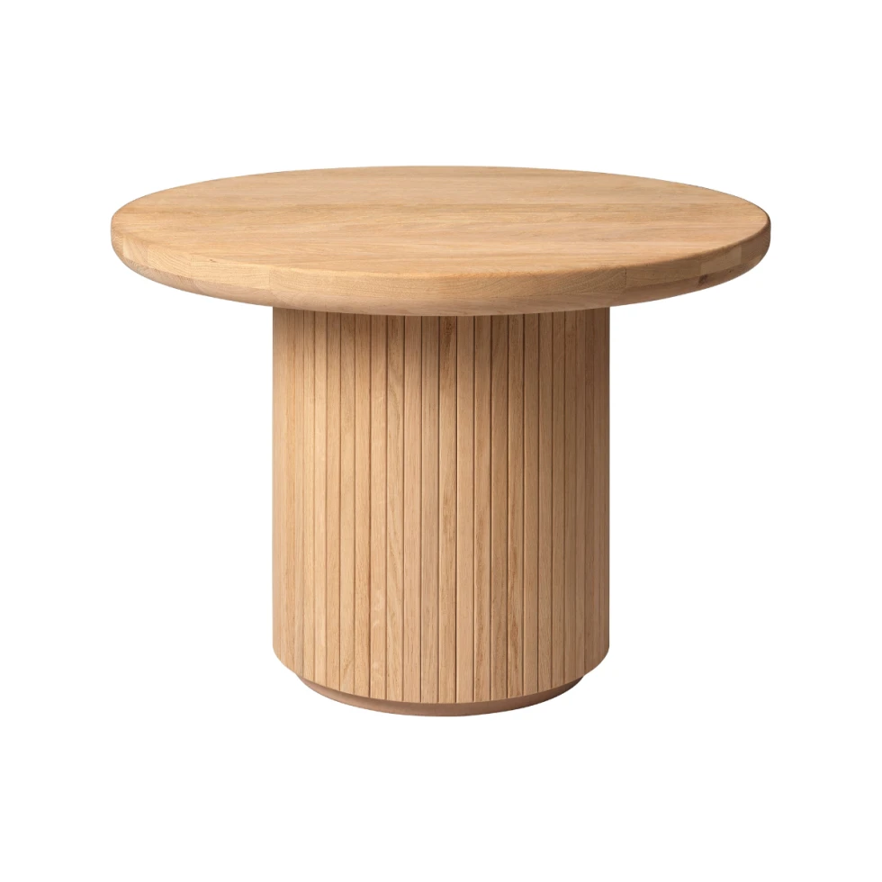 Stolik kawowy Moon o średnicy Ø60 dostępny jest z blatem z marmuru lub z drewna dębowego w trzech wykończeniach. Podstawa stolika to potężny, drewniany filar zdobiony pionowymi szczeblami. Stolik prezentuje się solidnie. Cienki blat dodaje mu lekkości.