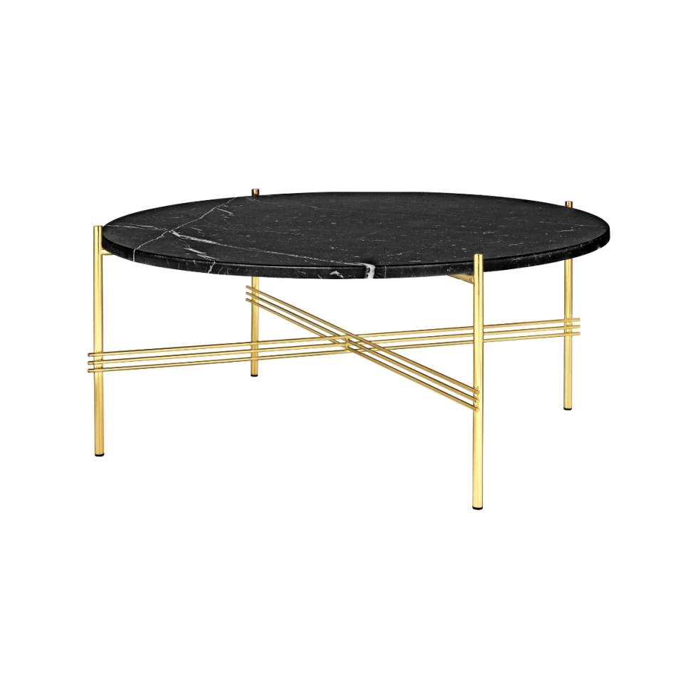 Niski stolik kawowy TS od marki Gubi i GamFratesi z dużym blatem na mosiężnej, błyszczącej ramie z marmurowym blatem. Stolik wygląda szykownie, stanowi element dekoracyjny dopełniający każde wnętrze. Kolekcja TS to stoliki kawowe i konsole w różnych kolorach i rozmiarach. Dostępne w wersji z ramą mosiężną lub stalową.