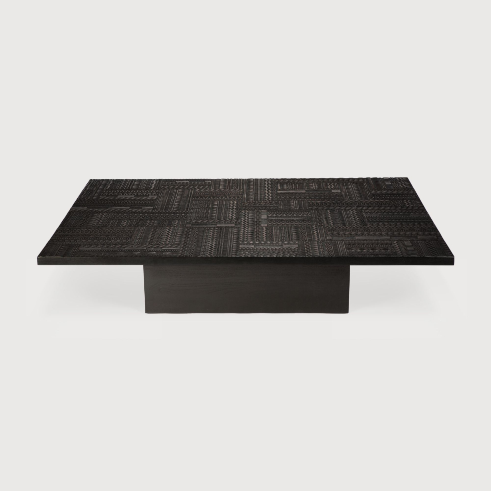 Stolik kawowy Tabwa Ethnicraft został wykonany z drewna. Wyróżnia go duży blat. Kolekcja Ancestors Tabwa to ponadczasowe meble o minimalistycznej sylwetce i niepowtarzalnym, wyrazistym charakterze. Ethnicraft nowoczesnym meblom nadał unikatowego designu. Są niczym dzieła sztuki. Każdy wzór jest starannie rzeźbiony. Nazwa kolekcji inspirowana jest kulturą Tabwa z Afryki Środkowej i pochodzi z zamiłowania tych plemion do liniowych motywów geometrycznych. W skład kolekcji wchodzą m.in. kredensy, szafki, stoliki kawowe, konsole, ławki, a także lustra.