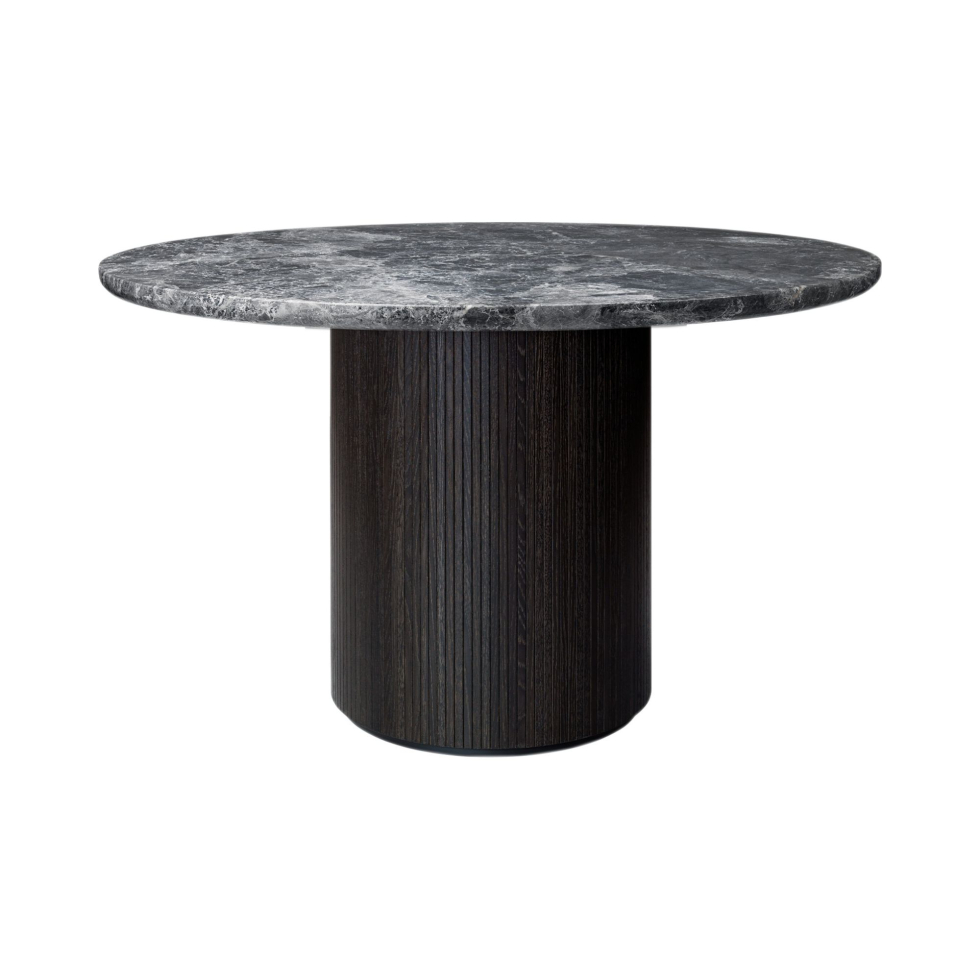 Okrągły stół do jadalni Moon o średnicy Ø150 dostępny jest z blatem z szarego marmuru lub z drewna dębowego w trzech wariantach kolorystycznych. Podstawa stołu to potężny, drewniany filar zdobiony pionowymi szczeblami. Konstrukcja stołu jest solidna i trwała. Cienki blat dodaje mu lekkości.