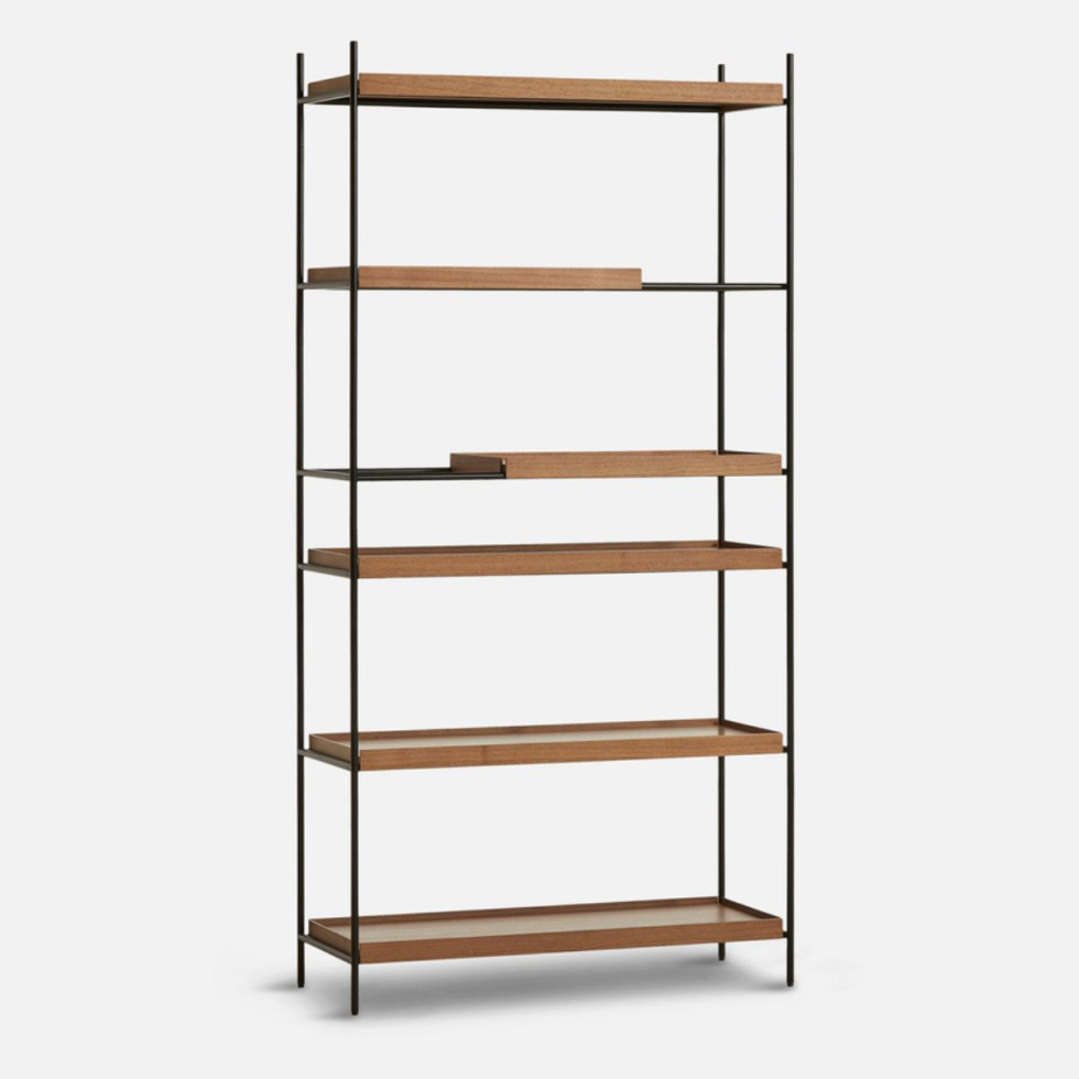 Regał Tray to system półek o prostych liniach i estetycznej symetrii, zaprojektowany przez Hanne Willmann dla marki Woud. Tace można umieścić na sześciu poziomach w metalowej ramie, w dowolny sposób. Luki w układzie półek, powstałe dzięki przesunięciu małych tac, pozwalają na umieszczenie wyższych przedmiotów. Wysoki regał Tray dostępny jest w ośmiu kombinacjach z półkami z drewna orzechowego w kolorze naturalnym lub czarnym.