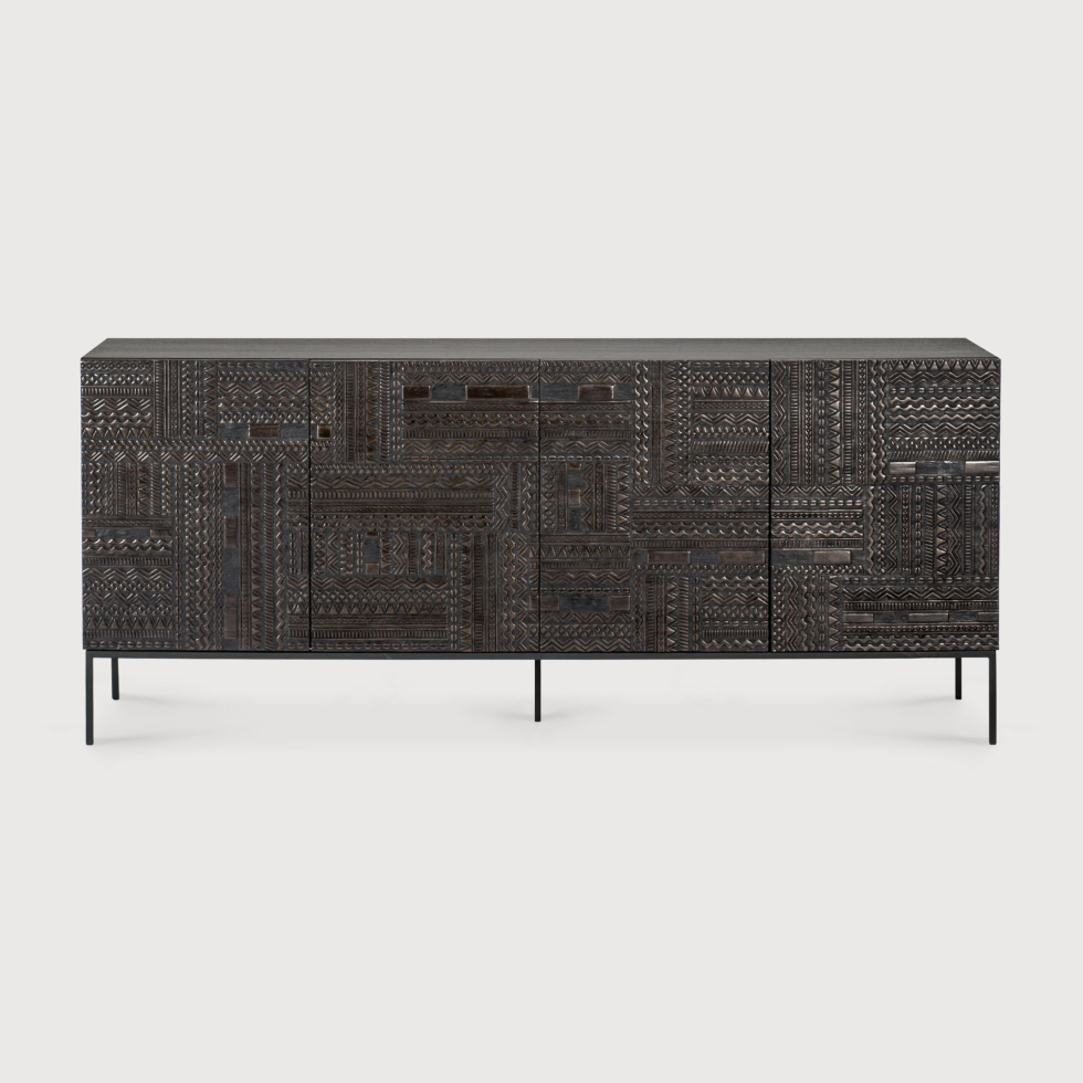 Komoda Ancestors Tabwa od Ethnicraft to trzy- lub czterodrzwiowy model. Został wykonany z forniru tekowego i dębowego na metalowych nogach w kolorze czarnym. Kolekcja Ancestors Tabwa to ponadczasowe meble o minimalistycznej sylwetce i niepowtarzalnym, wyrazistym charakterze. Ethnicraft nowoczesnym meblom nadał unikatowego designu. Każdy wzór jest starannie rzeźbiony. Nazwa kolekcji inspirowana jest kulturą Tabwa z Afryki Środkowej i pochodzi z zamiłowania tych plemion do liniowych motywów geometrycznych. W skład kolekcji wchodzą m.in. kredensy, szafki, stoliki kawowe, konsole, ławki, a także lustra.