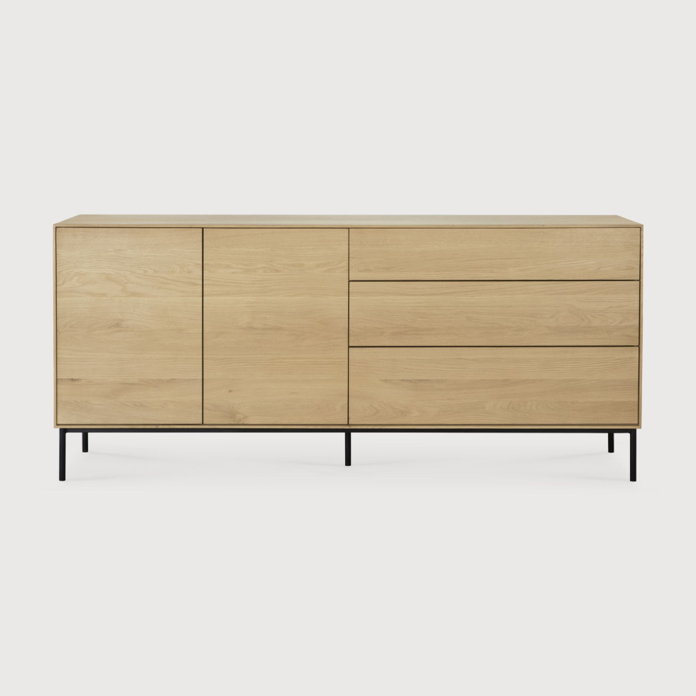 Kredens z kolekcji Whitebird od Ethnicraft to nowoczesność w klasycznej formie. Kredens posiada trzy pojemne szuflady oraz dwie pary drzwiczek. Całość została wykonana z solidnego drewna dębowego. Posiada metalowe, eleganckie nogi w kolorze czarnym, które pięknie komponują się z jasnym drewnem. Whitebird to bliźniacza kolekcja Blackbird. Meble z tej linii charakteryzują się geometrycznymi kształtami i prostymi liniami. Są bardzo funkcjonalne i przede wszystkim autentyczne. Idealne do nowoczesnej aranżacji.