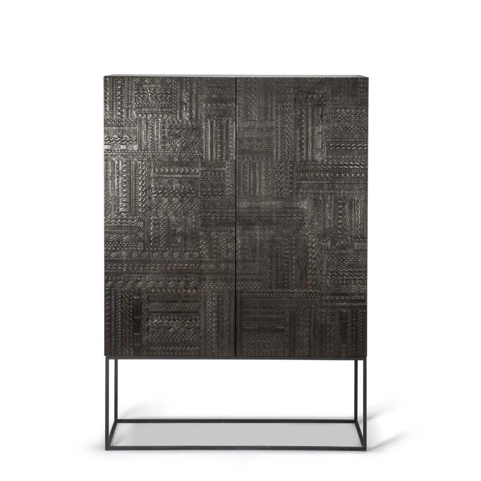 Szafka Ancestors Tabwa od Ethnicraft to dwudrzwiowy model z dwiema szufladami. Szafka została wykonana z forniru tekowego i dębowego na metalowej podstawie w kolorze czarnym. Kolekcja Ancestors Tabwa to ponadczasowe meble o minimalistycznej sylwetce i niepowtarzalnym, wyrazistym charakterze. Ethnicraft nowoczesnym meblom nadał unikatowego designu. Każdy wzór jest starannie rzeźbiony. Nazwa kolekcji inspirowana jest kulturą Tabwa z Afryki Środkowej i pochodzi z zamiłowania tych plemion do liniowych motywów geometrycznych. W skład kolekcji wchodzą m.in. kredensy, szafki, stoliki kawowe, konsole, ławki, a także lustra.