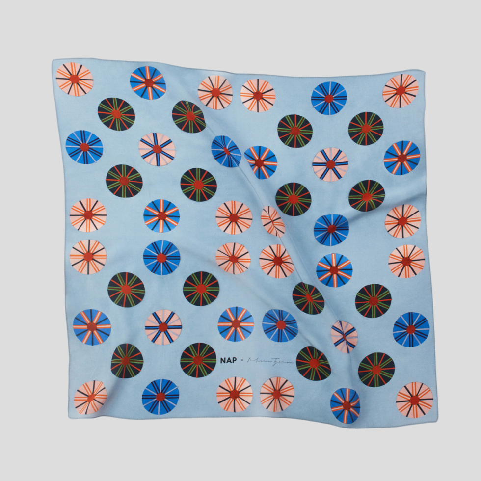 Błękitna apaszka Cacka NAP w kolaboracji z Marią Tyniec. Inspirowana ludowymi wycinankami. W projektach artystki można zauważyć symetrię i powtarzalność oraz zamiłowanie do wyrazistych zestawień kolorów. Podobnie jak wycinanki, które dawniej służyły jako ozdoba wnętrza chłopskich chat, apaszka doda stylu każdej kreacji. Maria Tyniec jest absolwentką warszawskiej Akademii Sztuk Pięknych. Obecnie zajmuje się architekturą wnętrz, publicystyką oraz malarstwem. Projektuje wnętrza, meble oraz tkaniny dekoracyjne.