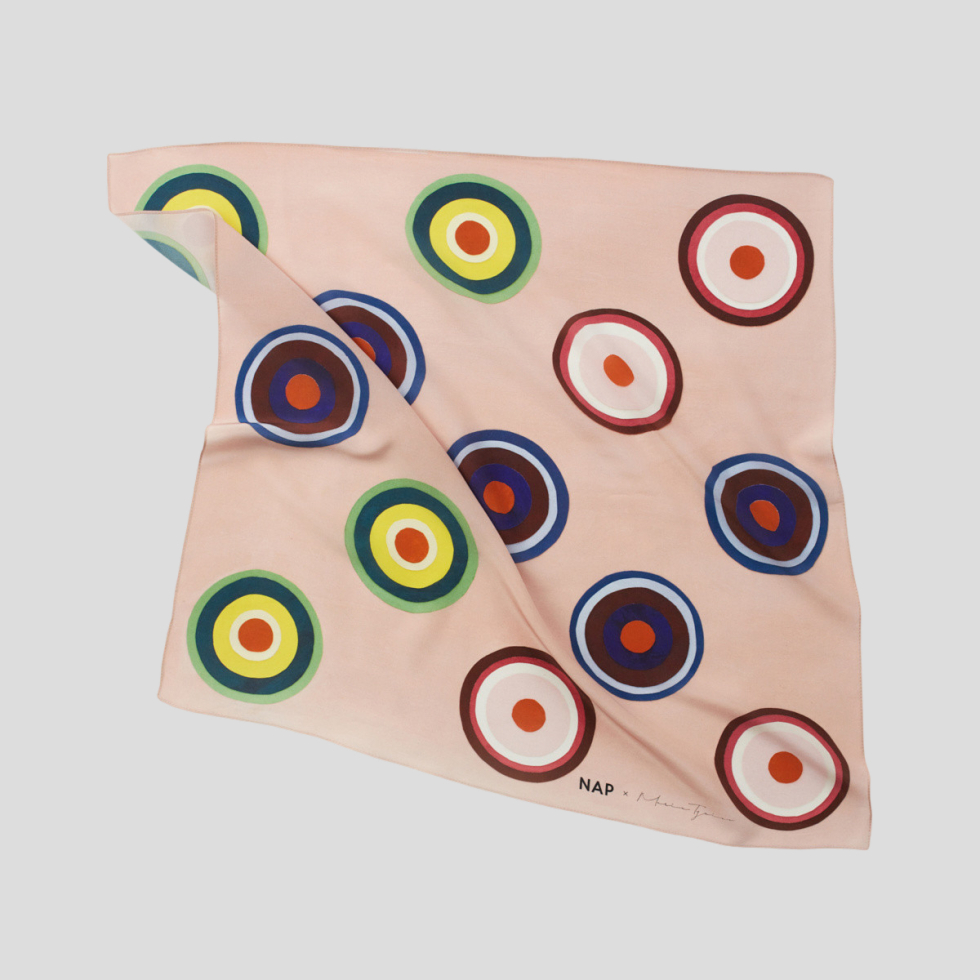 Jasnoóżowa apaszka Cacka NAP w kolaboracji z Marią Tyniec. Inspirowana ludowymi wycinankami. W projektach artystki można zauważyć symetrię i powtarzalność oraz zamiłowanie do wyrazistych zestawień kolorów. Podobnie jak wycinanki, które dawniej służyły jako ozdoba wnętrza chłopskich chat, apaszka doda stylu każdej kreacji. Maria Tyniec jest absolwentką warszawskiej Akademii Sztuk Pięknych. Obecnie zajmuje się architekturą wnętrz, publicystyką oraz malarstwem. Projektuje wnętrza, meble oraz tkaniny dekoracyjne.