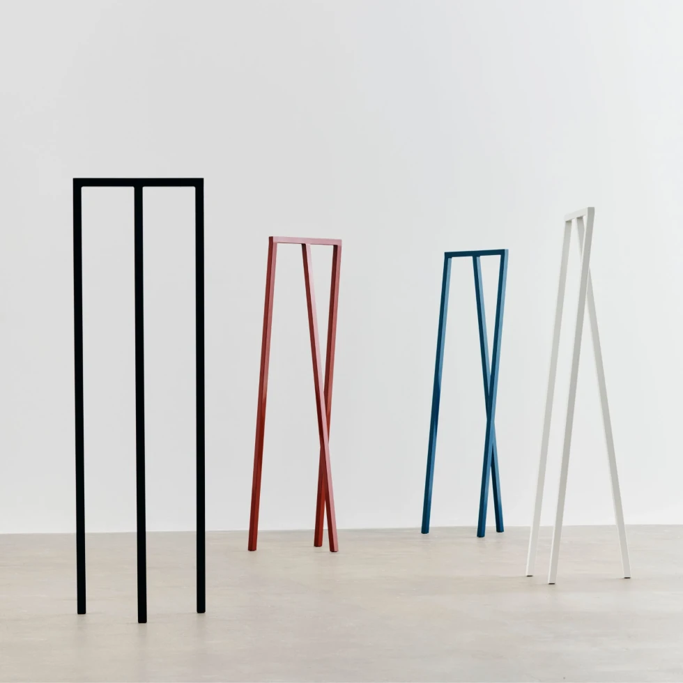 Minimalistyczny wieszak na ubrania Loop Stand Hall od marki HAY. Wykonany ze stali malowanej proszkowo. Wyróżnia się geometrycznymi kształtami oraz skośnymi, trzema nogami. Wieszak jest stabilny i wytrzymały. Doskonale wpasuje się zarówno we wnętrza prywatne, jak i komercyjne. Loop dostępny jest również w większym rozmiarze - Loop Stand Wardrobe.