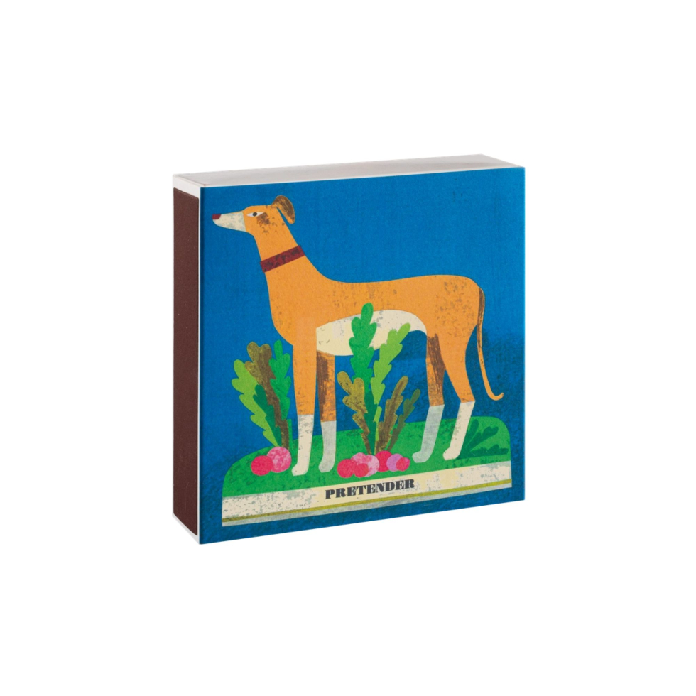 Kwadratowe pudełko zapałek Archivist przedstawia uroczego charta stojącego wśród rzodkiewek na intensywnie niebieskim tle. Ilustracja została zaprojektowana przez Marion Elliot, znaną z wyjątkowego, lekkiego i pełnego uroku stylu.