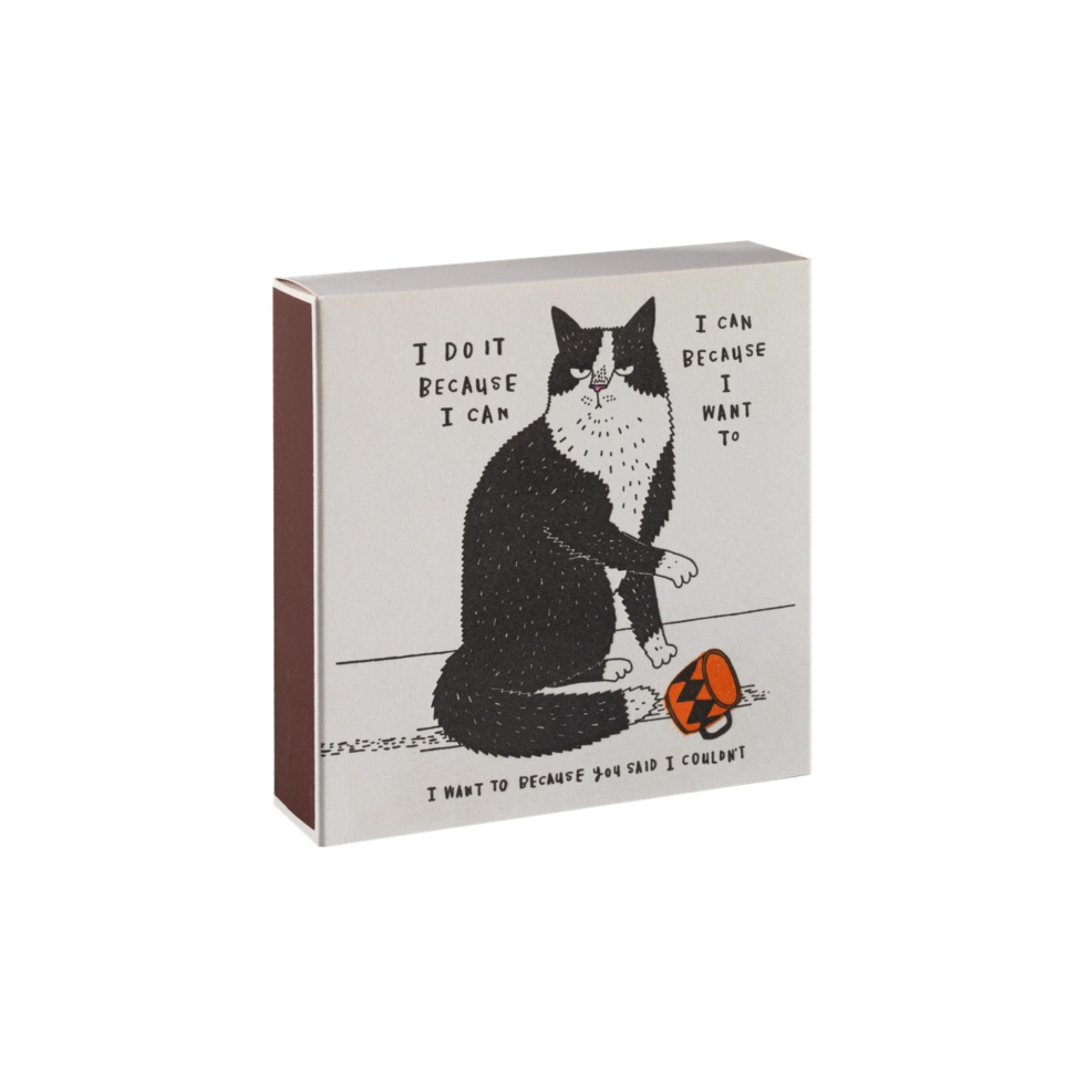 Charakterystyczne, kwadratowe pudełko zapałek przedstawia czarno-białego kota strącającego kubek, opatrzone napisem: „I do it because I can, I can because I want to, I want to because you said I couldn't.” Projekt został stworzony przez Charlotte Farmer.